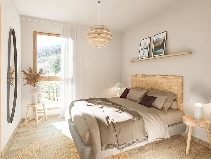 Les trois étages intermédiaires de la résidence offrent une vue panoramique époustouflante sur les montagnes depuis leurs balcons ensoleillés. De plus, chaque appartement est doté d'un casier à skis, d'une cave privative et d'une à deux places de stationnement en sous-sol.