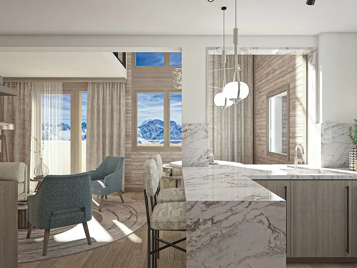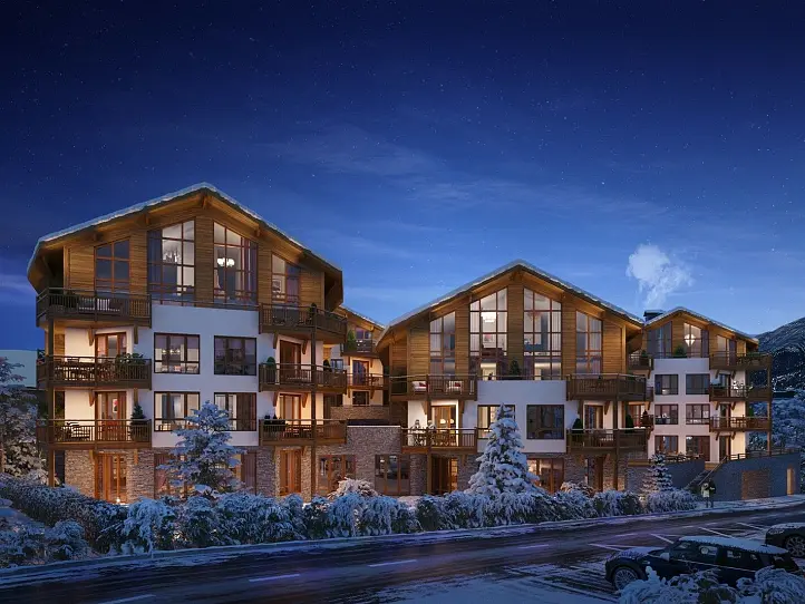 Expression offers 40 stunning apartments in five new buildings, blending seamlessly with the picturesque surroundings. The white barn-style facades with wood cladding on the upper floors and natural stone on the ground floor, along with sloping roofs, create a charming Alpine aesthetic. Each apartment boasts a terrace or balcony to soak up the 300 days of sunshine and breathtaking mountain views. Inside, the modern Alpine-inspired design features wood flooring, wood cladding, and large windows for natural light. The penthouses boast double-height cathedral ceilings and floor-to-ceiling windows. The communal wellness area with a sauna and hammam is perfect for unwinding after a day on the slopes.
