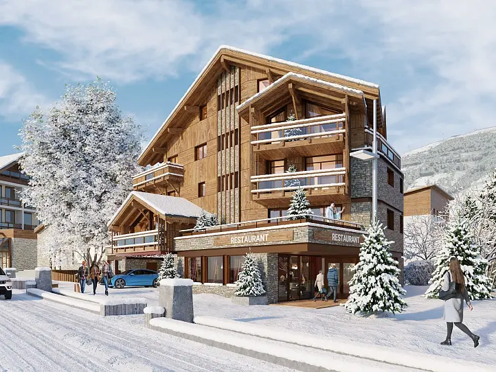 This striking residence combines multiple rooflines, larch wood, stone, and integrated lighting for a timeless yet contemporary design. Inside, the apartments feature high-end finishes, with old wood, stone, and leather accents. Spacious layouts range from 45 to 134 sqm, with options from 1-bedroom + cabine to 4-bedroom + cabine penthouses. Each unit boasts a large balcony or terrace, while most also offer the option to install an outdoor jacuzzi. A custom fragrance and hotel-style lighting elevate the common areas of the residence while all units come with parking and a ski locker.