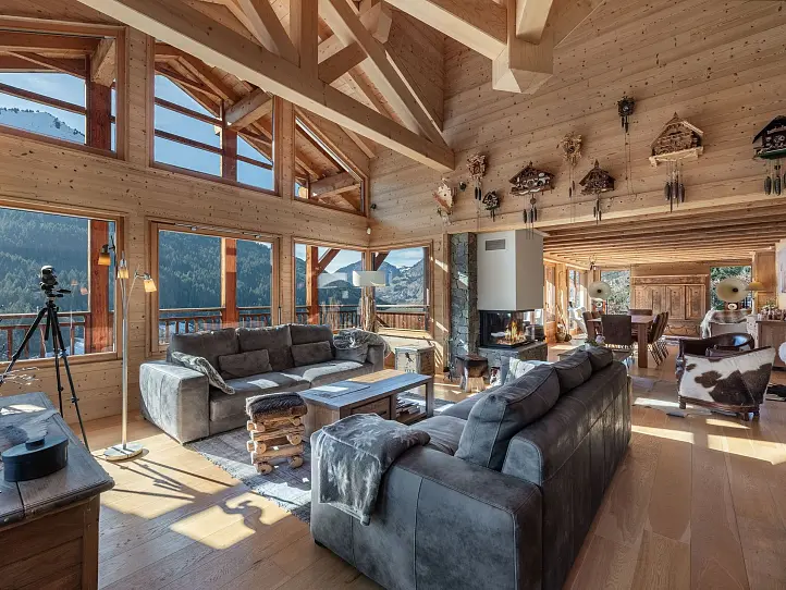 This traditional chalet offers a bright living area with high ceilings, an open-plan kitchen, and 5 bedrooms, each with en-suite facilities. The garden level features a luxurious 50m² wellness area with a sauna, hammam, and jacuzzi, perfect for relaxing after a day on the slopes. The property also includes a double garage, a wine cellar, and a panoramic lounge area, making it an ideal retreat for both family and guests.