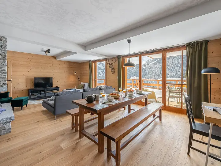 Spanning 110 sqm across the first floor of a chalet-style building, this apartment is perfect for families or ski trips with friends as it features three bedrooms and plenty of space for entertaining thanks to its large, bright living and dining area with an open kitchen and a cosy fireplace. The living area opens up to a 22 sqm terrace - perfect for taking in the mountain views. The property features well-maintained modern alpine interiors with wood flooring and wood panelling or natural stone on some of the walls. A garage is included.