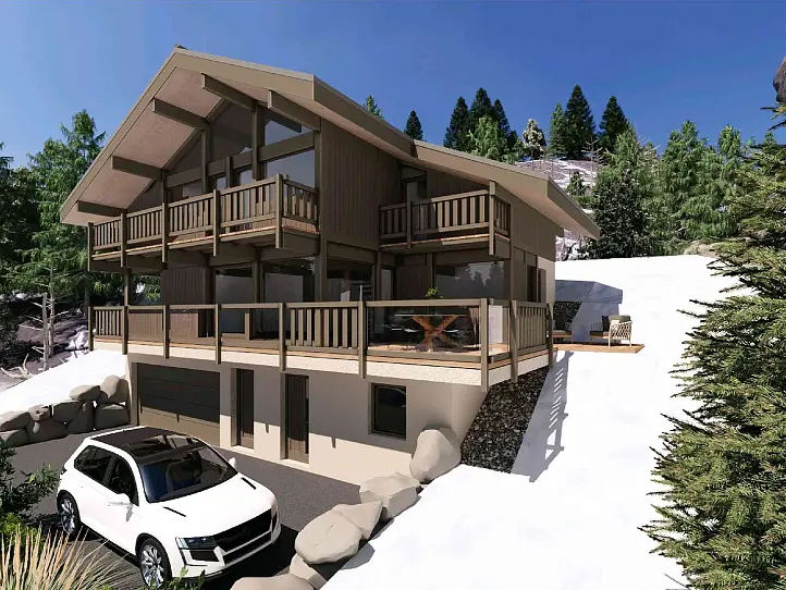 Spanning 181 sqm across three floors, with an additional 37 sqm internal garage for two cars, the chalet sits on a 575 sqm plot. It features five en-suite bedrooms, a spacious open-plan living and dining area opening onto a large terrace, and a bespoke kitchen with island and separate storage cellar. Wellness facilities include a sauna and gym with shower. A ski and boot room with secondary entrance enhances functionality, while construction is entrusted to a renowned chalet builder.