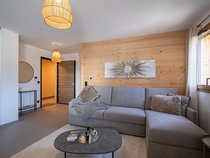 Designed for family living, each apartment comes with a fully-equipped kitchen and opens onto an outdoor living area overlooking either the village or the lower valley. Spacious and light thanks to an open-concept layout, all of the units come with additional storage space comprising both a ski room and a separate cellar. Underground parking spaces and garages are available within the residence at an additional cost.