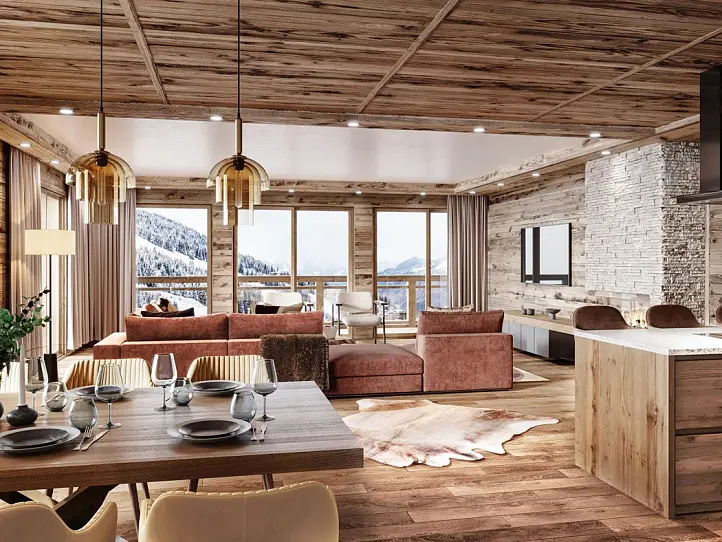 Experience the perfect blend of authenticity and modern comfort in these stunning residences. With contemporary Alpine interiors featuring wood paneling, parquet flooring, and large glass windows, natural light floods the space. The traditional Alpine-style facade boasts wood cladding, natural stone, and a gabled roof with multiple apexes, creating cathedral-style ceilings in the top-floor properties.