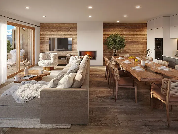 The project comprises two large chalets divided into 12 apartments ranging from 95 to 130 sqm, each with 3–4 bedrooms. All residences benefit from outdoor space and open west-facing views, with optional jacuzzis for ground-floor units. High-quality finishes are delivered by a respected local developer. Each apartment includes a ski locker, cellar and outdoor parking space, with the flexibility to merge units into larger apartments or create an individual chalet.