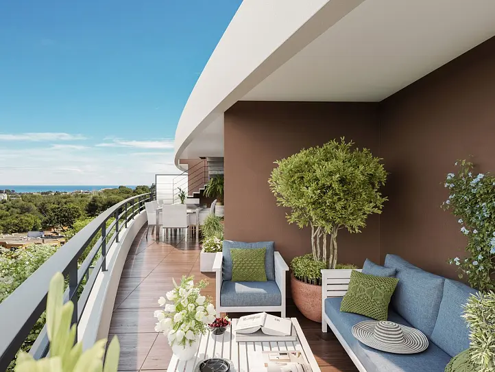 Designed to embrace light and landscape, Vert Azur features generous outdoor living spaces, including terraces and balconies that extend the living areas into the open air, perfect for enjoying the gentle Riviera climate. At the top level, select 4-room penthouse apartments present expansive solarium terraces and sky-high perspectives that invite moments of peaceful contemplation. The residence also boasts a rooftop pool set among the pines, offering a unique oasis to relax and socialize.