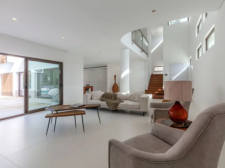 This 306 sqm villa sits on a 1,249 sqm plot and has been carefully designed to maximise light, space, and livability. Expansive windows invite the outdoors in, while the home’s sleek architecture ensures privacy and comfort. On the ground floor, a generous open-plan living and dining area connects effortlessly to the landscaped garden and pool, perfect for entertaining. This level is complete with a modern, fully equipped kitchen with a pantry, a private suite, laundry, and a garage.
