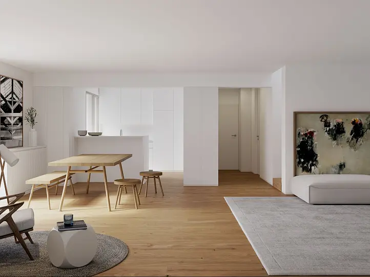 Set across four volumes, Páteo da Cordoaria comprises 16 apartments ranging from one to four bedrooms. The buildings are defined by clean architectural lines and a material language rooted in craft and quality. Interiors feature natural oak flooring, bespoke white-lacquered joinery and fully equipped kitchens with Corian worktops. Bathrooms are clad in Ataíja Azul stone and include floor heating. Viúva Lamego tiles grace the façades, reflecting light with subtle irregularity, while all units benefit from private underground parking and an electric vehicle charger.