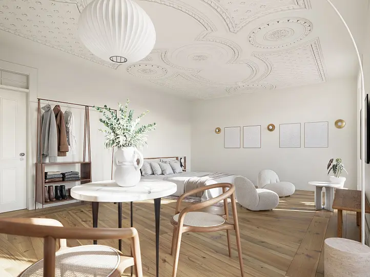 The apartments benefit from centralised climate control, indirect lighting, and secure access, ensuring both comfort and security. The building itself has been restored to its former grandeur, featuring a classic façade that harmonises with the surrounding historic streetscape. Residents also enjoy the convenience of an on-site property management service, making this an effortless investment for those looking to generate income through short- or long-term rentals.