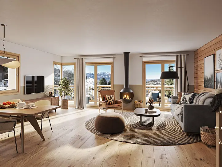 Beläget i ett upphöjt läge i ett lugnt villaområde erbjuder denna exklusiva fastighet 15 genomtänkt utformade lägenheter och takvåningar i duplex, fördelade på två traditionella chalets. Lägenheterna har 1-4 sovrum och varierar mellan 44-109 kvm. Varje bostad har egen uteplats i form av terrass, balkong eller trädgård, perfekt för att njuta av den storslagna utsikten över Aravis-bergen.